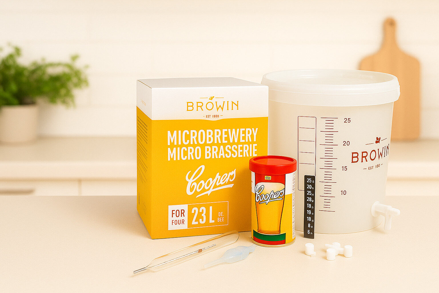 Šis rinkinys skirtas 23 litrams alaus pagaminti. Jame yra visi reikalingi įrankiai: fermentavimo indas, hidrometras, termometras ir, žinoma, alus koncentratas. Jums tereikia vandens, šiek tiek cukraus ir kantrybės!