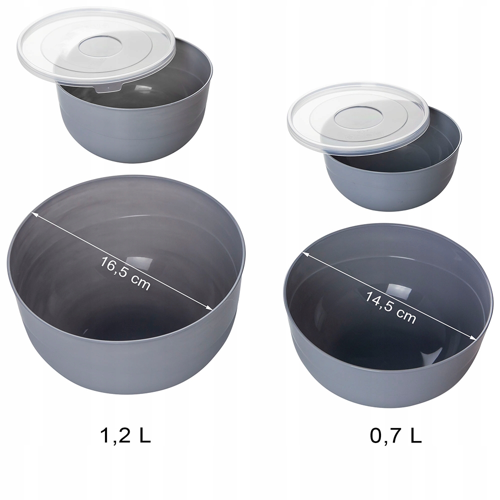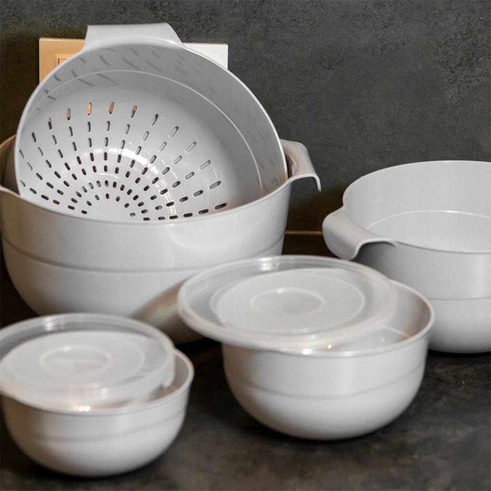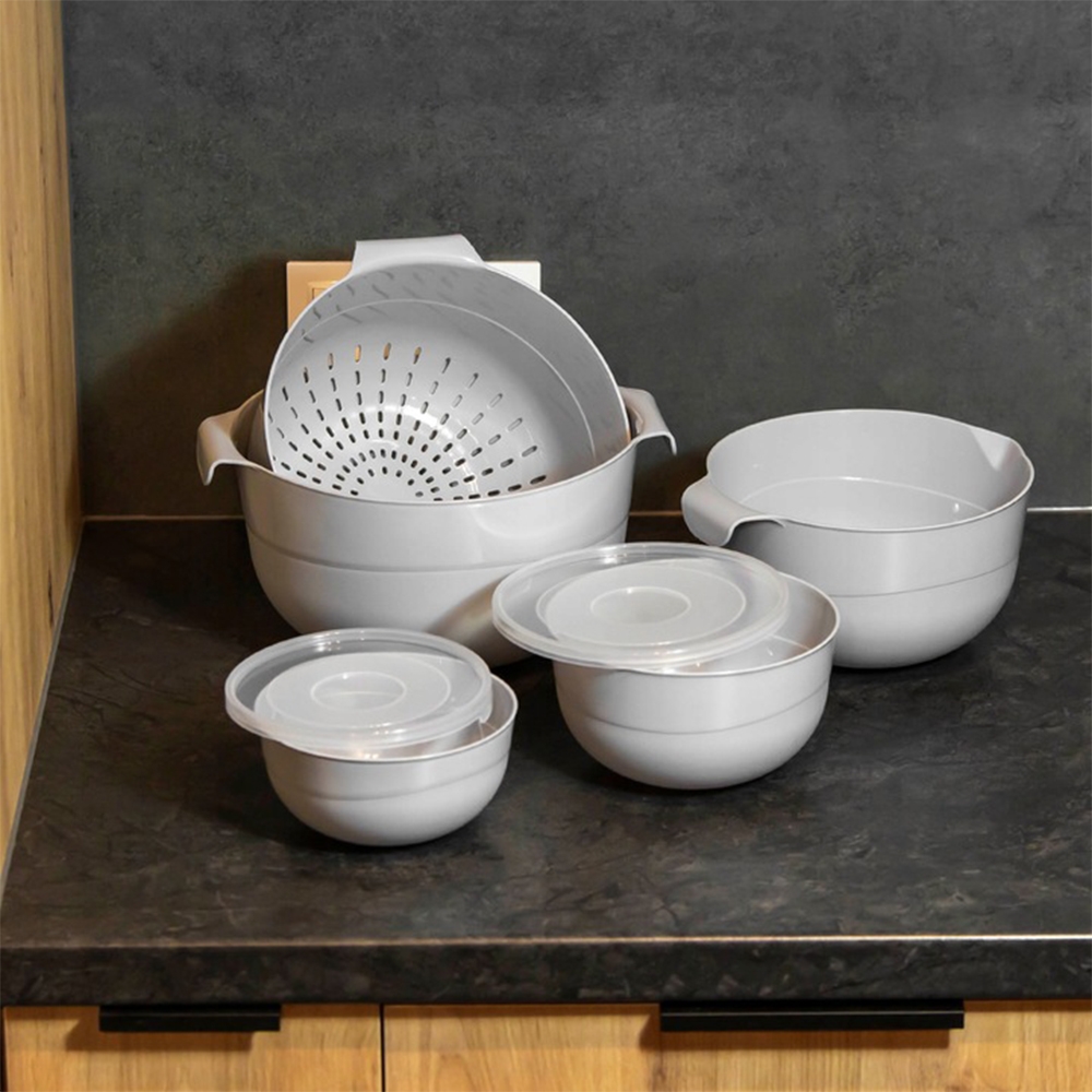 - Rinkinį sudaro: 4L. dubuo, 2L dubuo, 3L koštuvas, 1,2L ir 0,7L indeliai, 2 vnt. dangteliai.