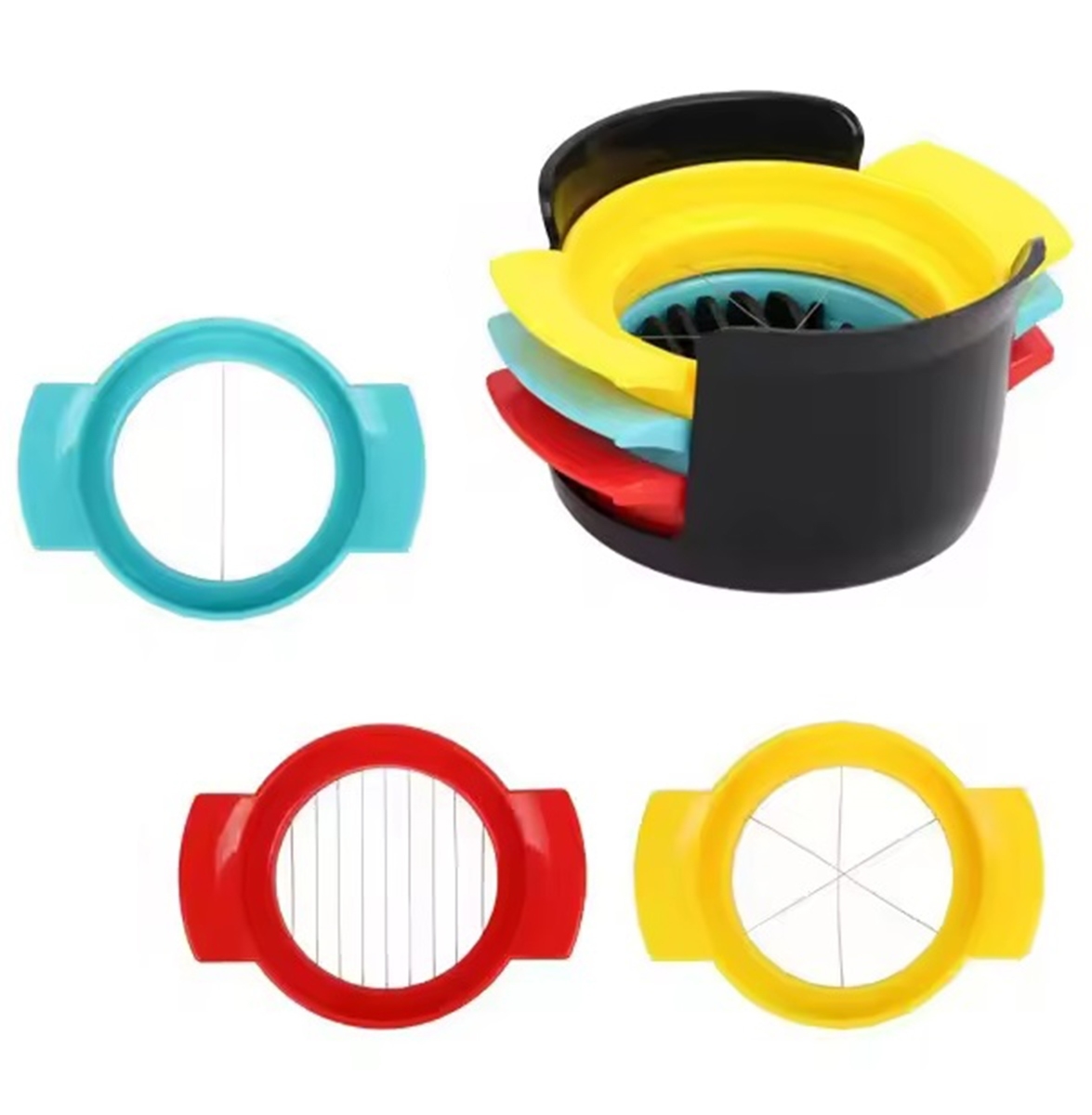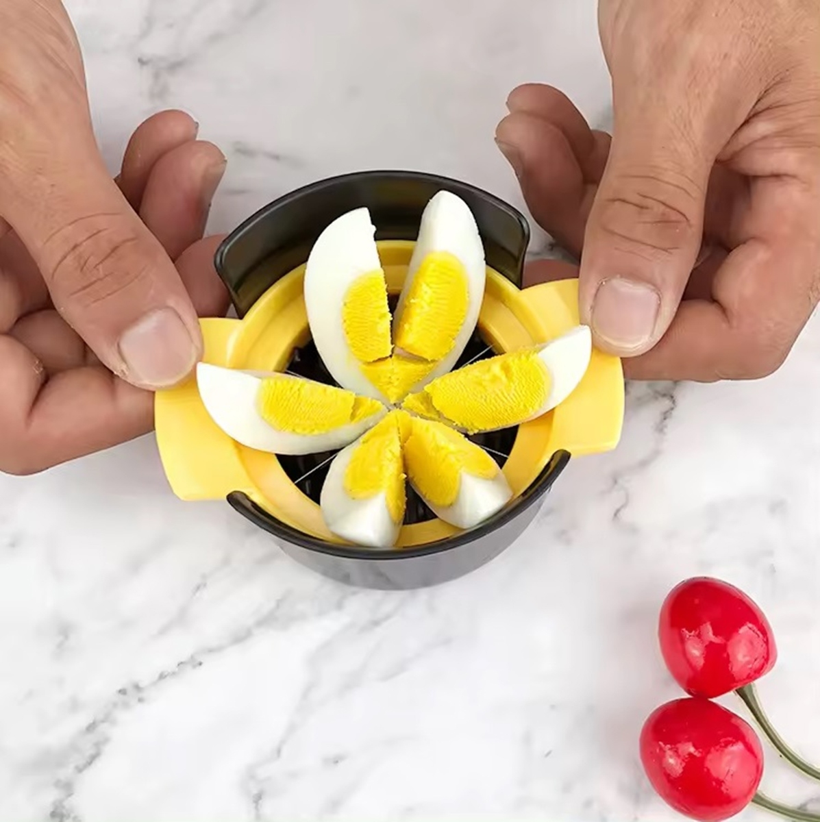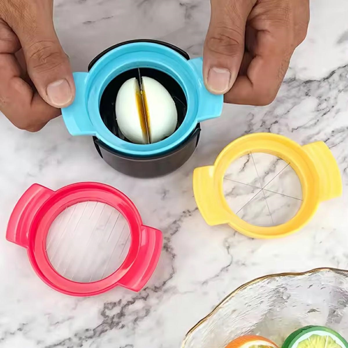 Itin praktiška kiaušinių pjaustyklė – 3 in 1. Ypatinga konstrukcija aprūpinta 3 skirtingais priedais, kurie leidžia kiaušinius pjaustyti skirtingais raštais.