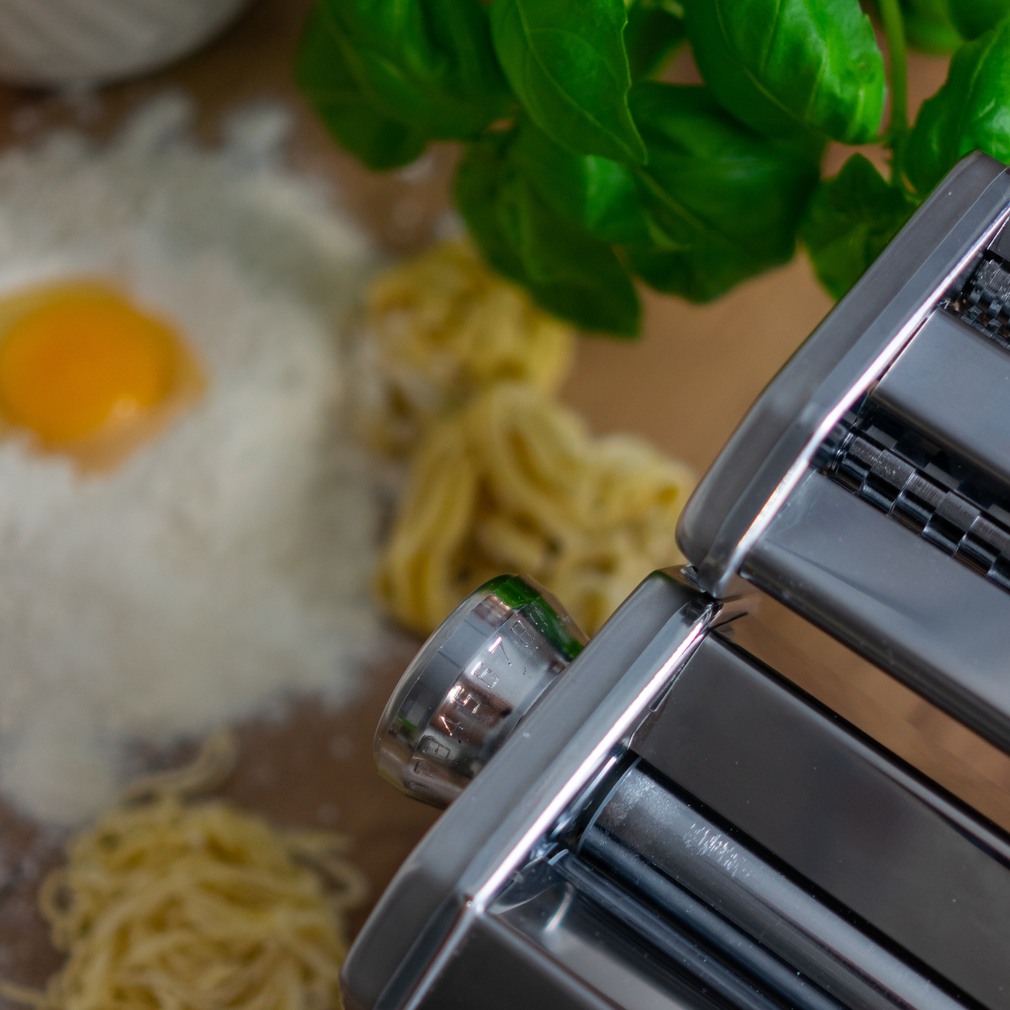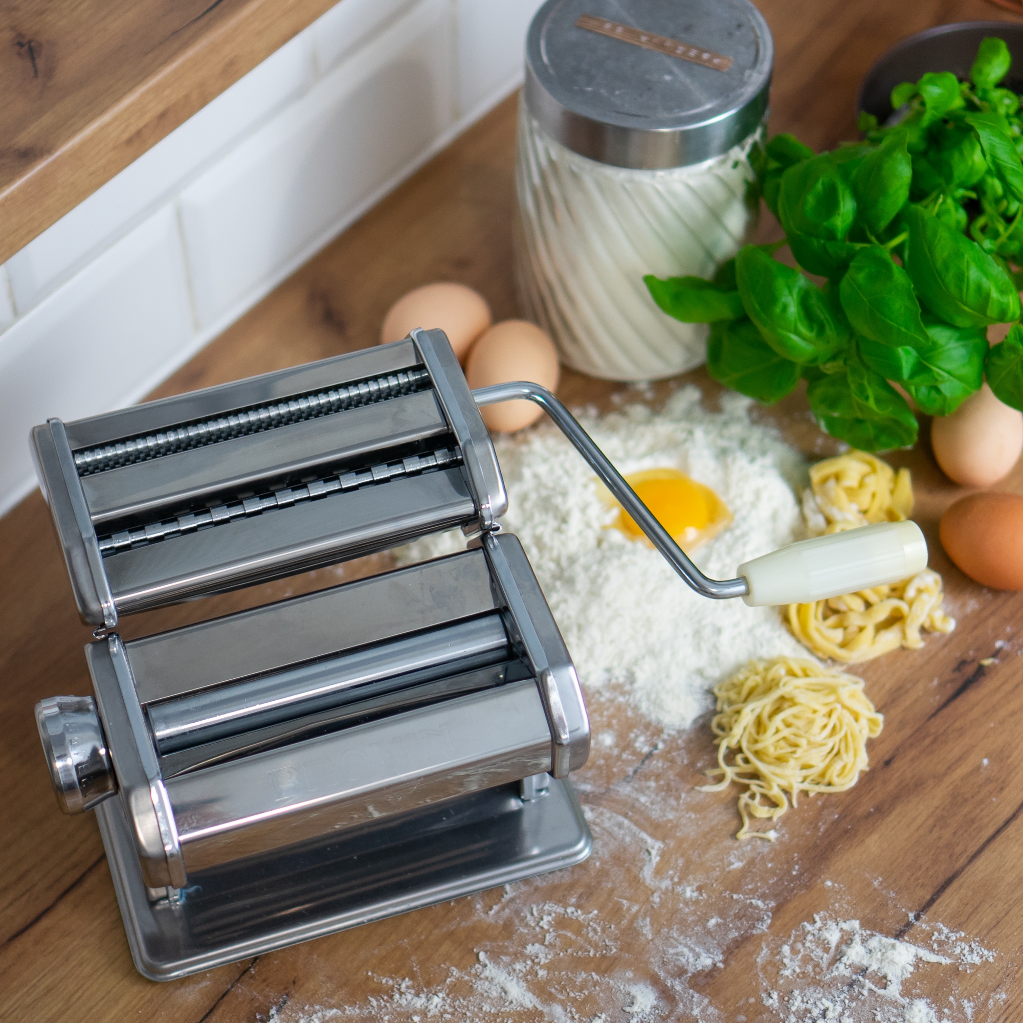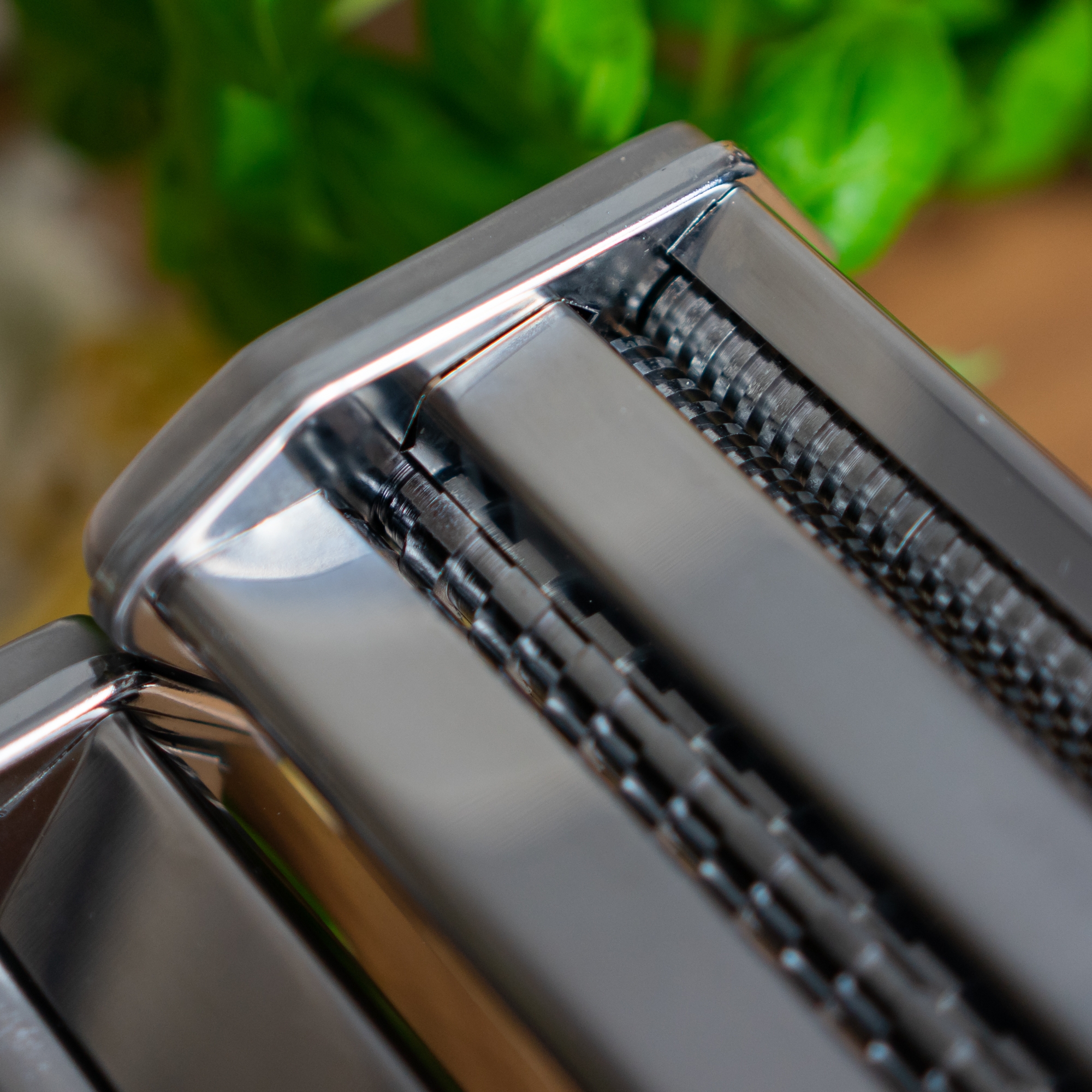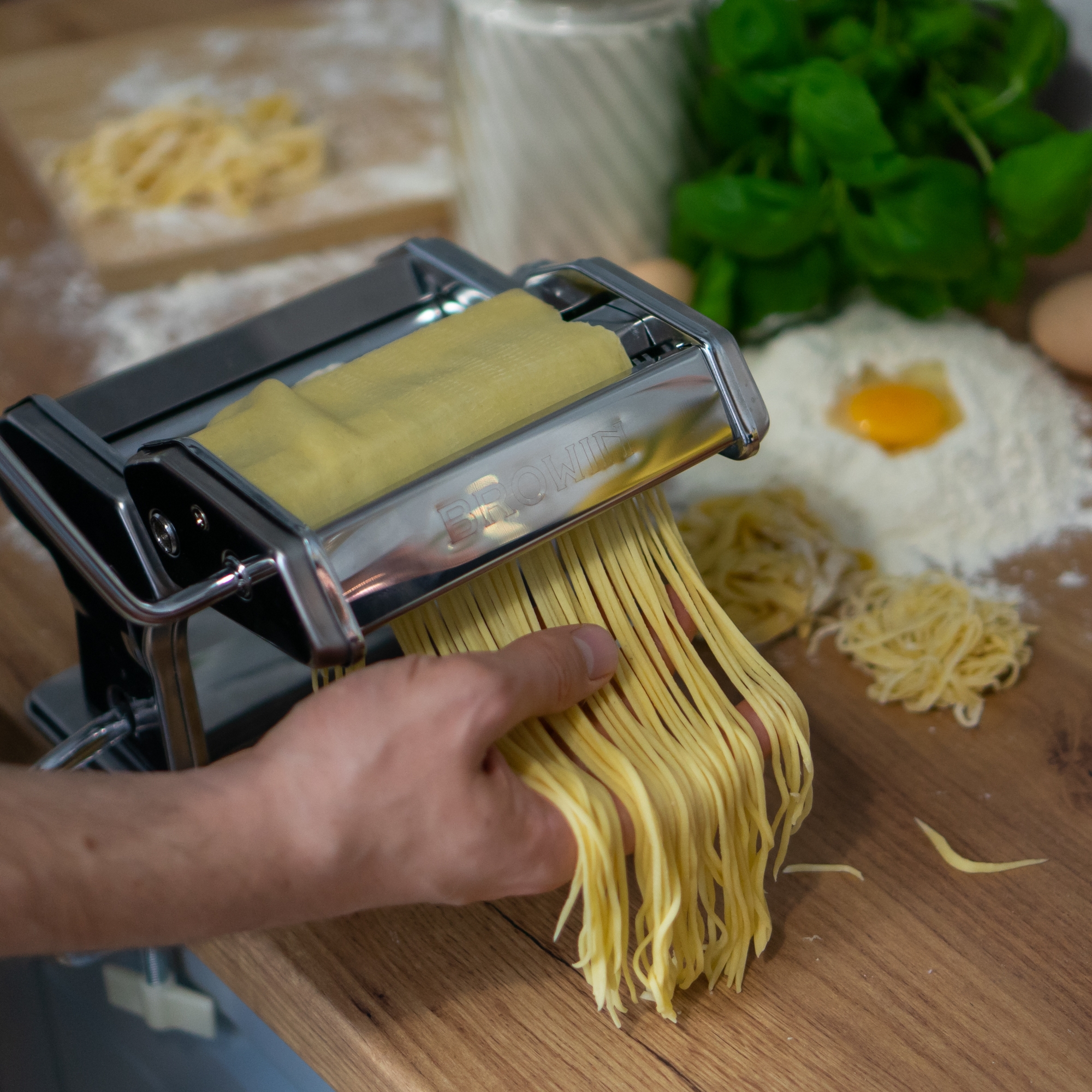 Pakuotės turinys: Makaronų gaminimo mašinos korpusas su grūdinto plieno voleliais su papildoma rankenėle tešlos storiui reguliuoti nuo 0,2 iki 2,2 mm. Priedas dviejų storių (1,5 mm arba 6,6 mm) makaronų pjaustymui. Antgalis mašinai pritvirtinti prie viršaus. Viena rankena skirta 3 ritinėlių rinkiniams.