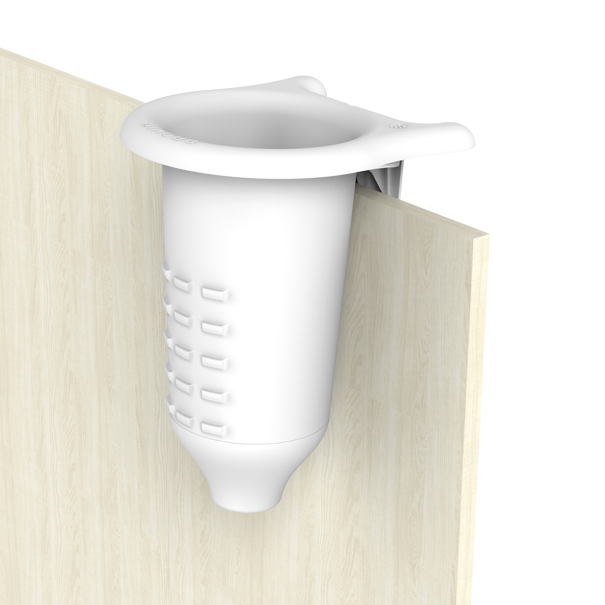 - Saugiai tvirtinamas horizontalioje (pvz., ant stalo) arba vertikalioje padėtyje (ant spintelės durų) – dėka daugiafunkcio pagrindo su kojele ir griebtuvais bei tvirtinimo kronšteino, kuris tinka daugumai stalviršių (maks. 60 mm).