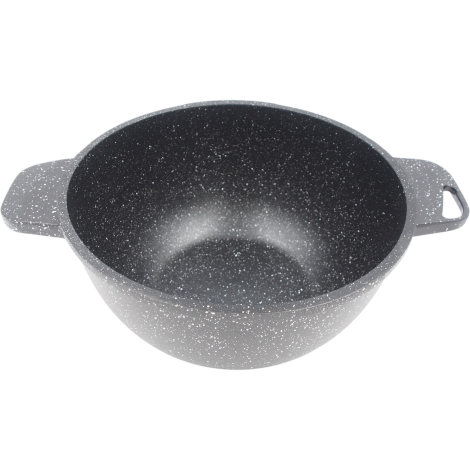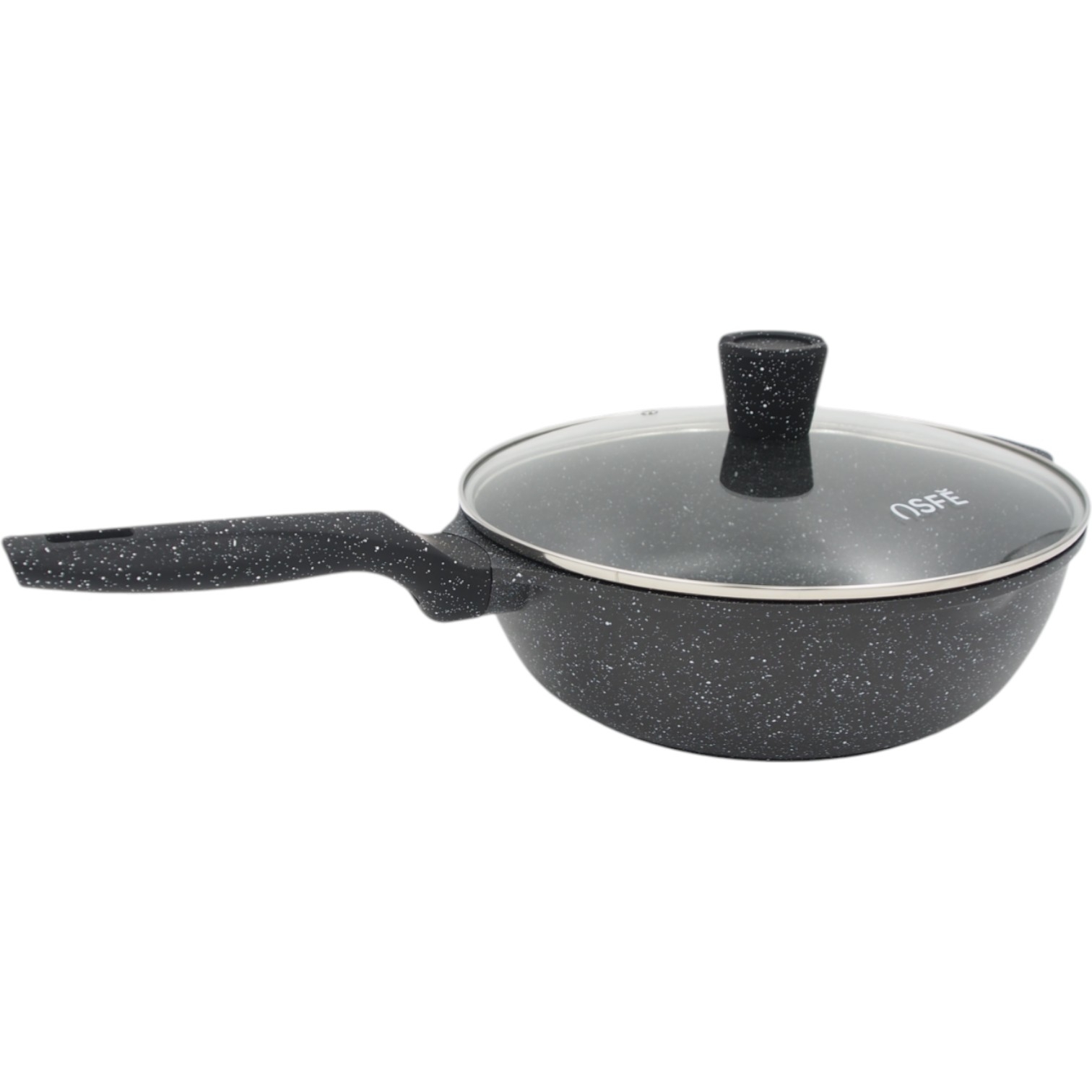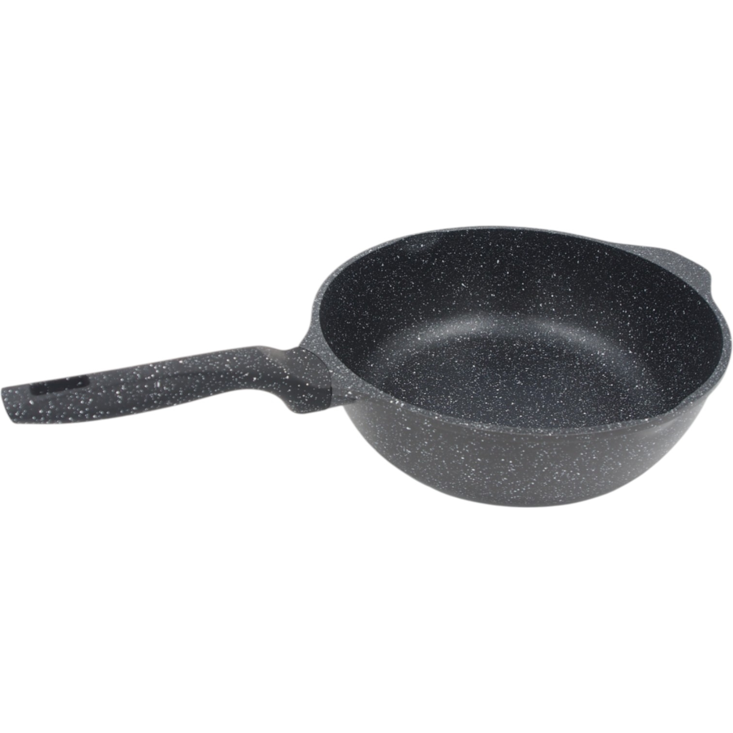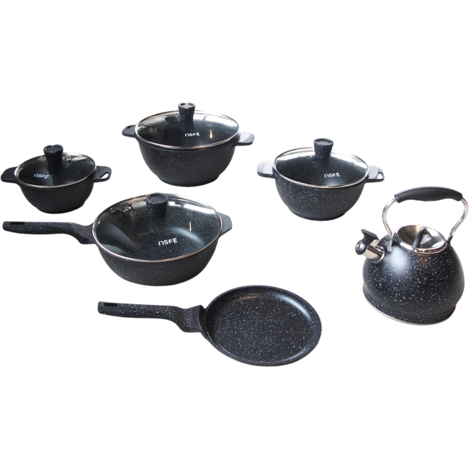 Pagamintas iš aukštos kokybės aliuminio, padengto atsparia granito danga, šis rinkinys užtikrina puikų šilumos pasiskirstymą ir ilgaamžiškumą. Juoda matinė spalva su baltomis taškelėmis suteikia išskirtinį ir prabangų vaizdą kiekvienai virtuvei.