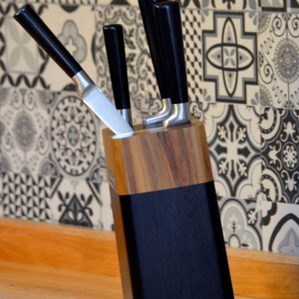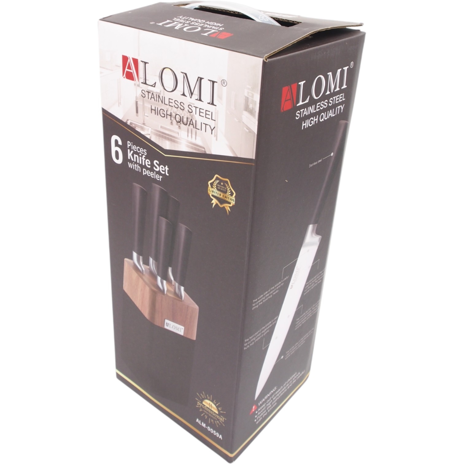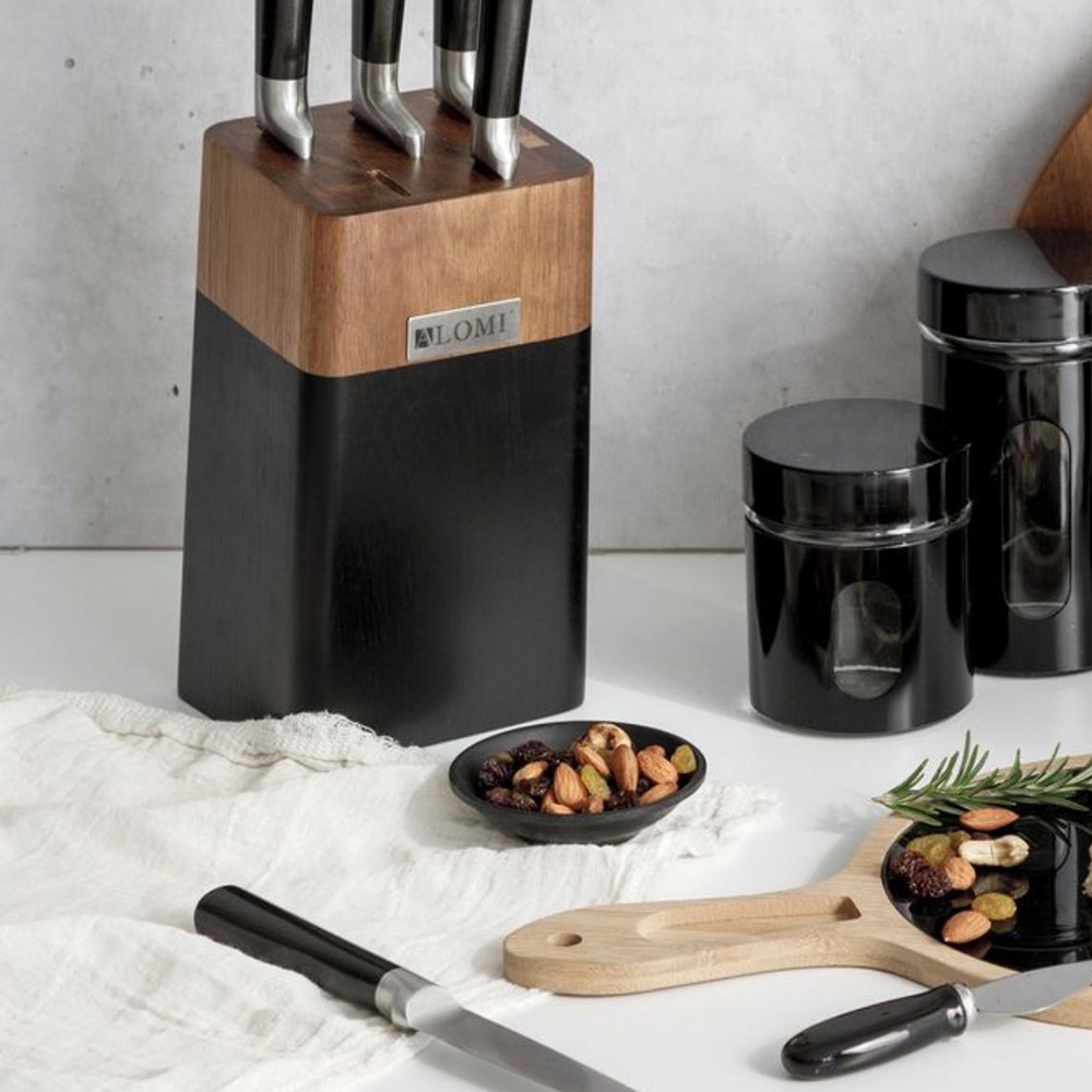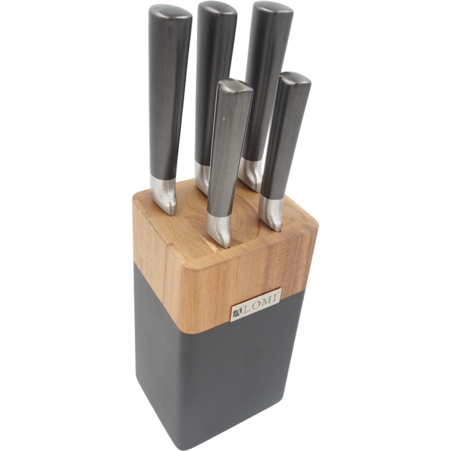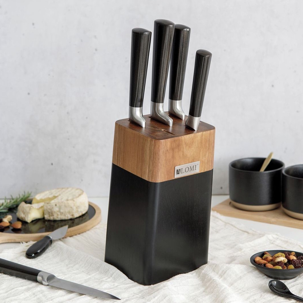 Aukštos kokybės ALOMI nerūdijančio plieno peilių rinkinys – tai praktiškas pasirinkimas kiekvienai virtuvei. Komplektą sudaro 5 aštrūs peiliai bei daržovių skustuvas, visi laikomi elegantiškame mediniame stove su moderniu juodos spalvos akcentu.