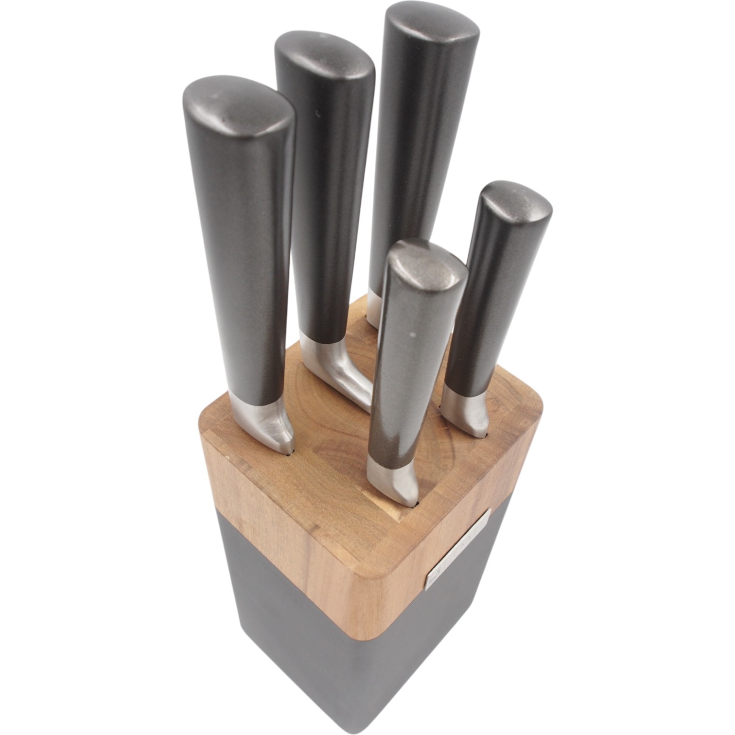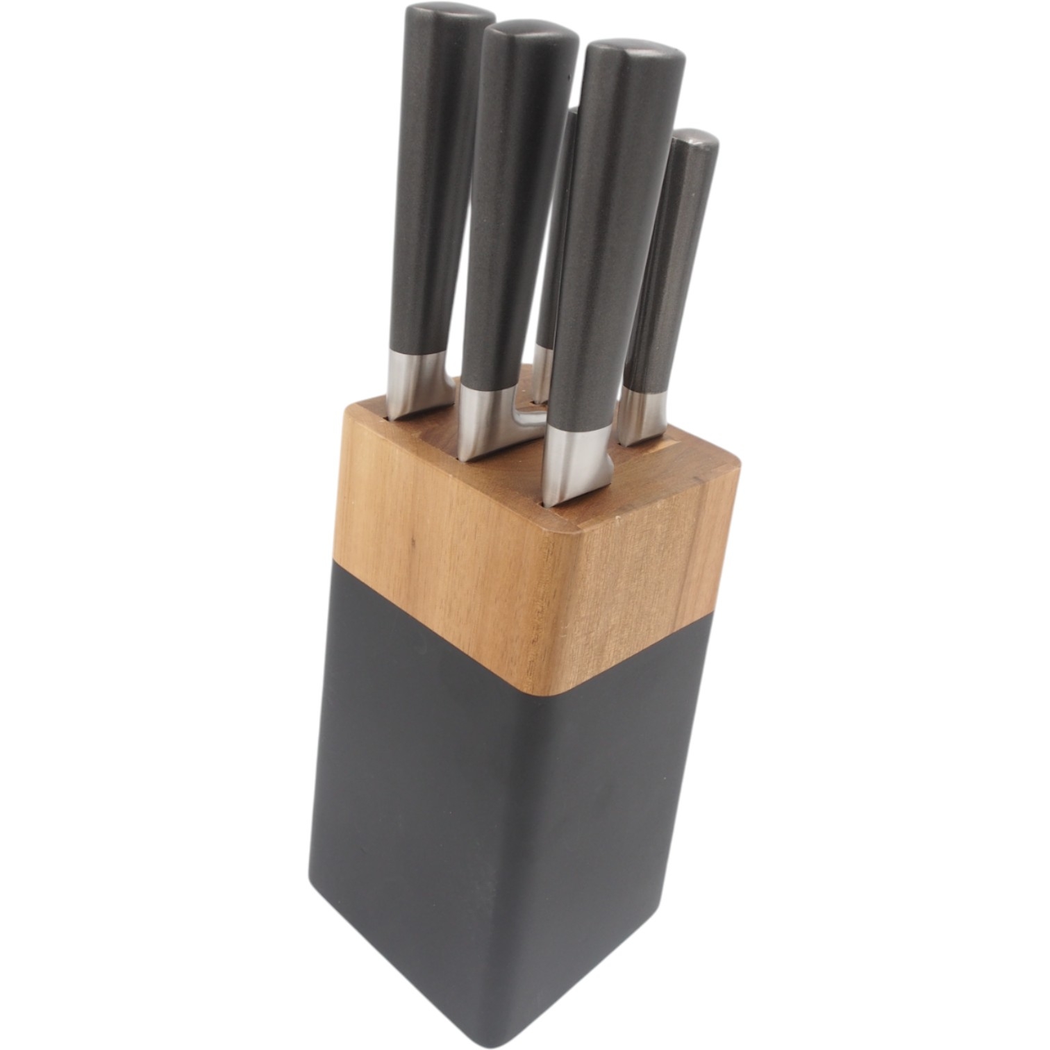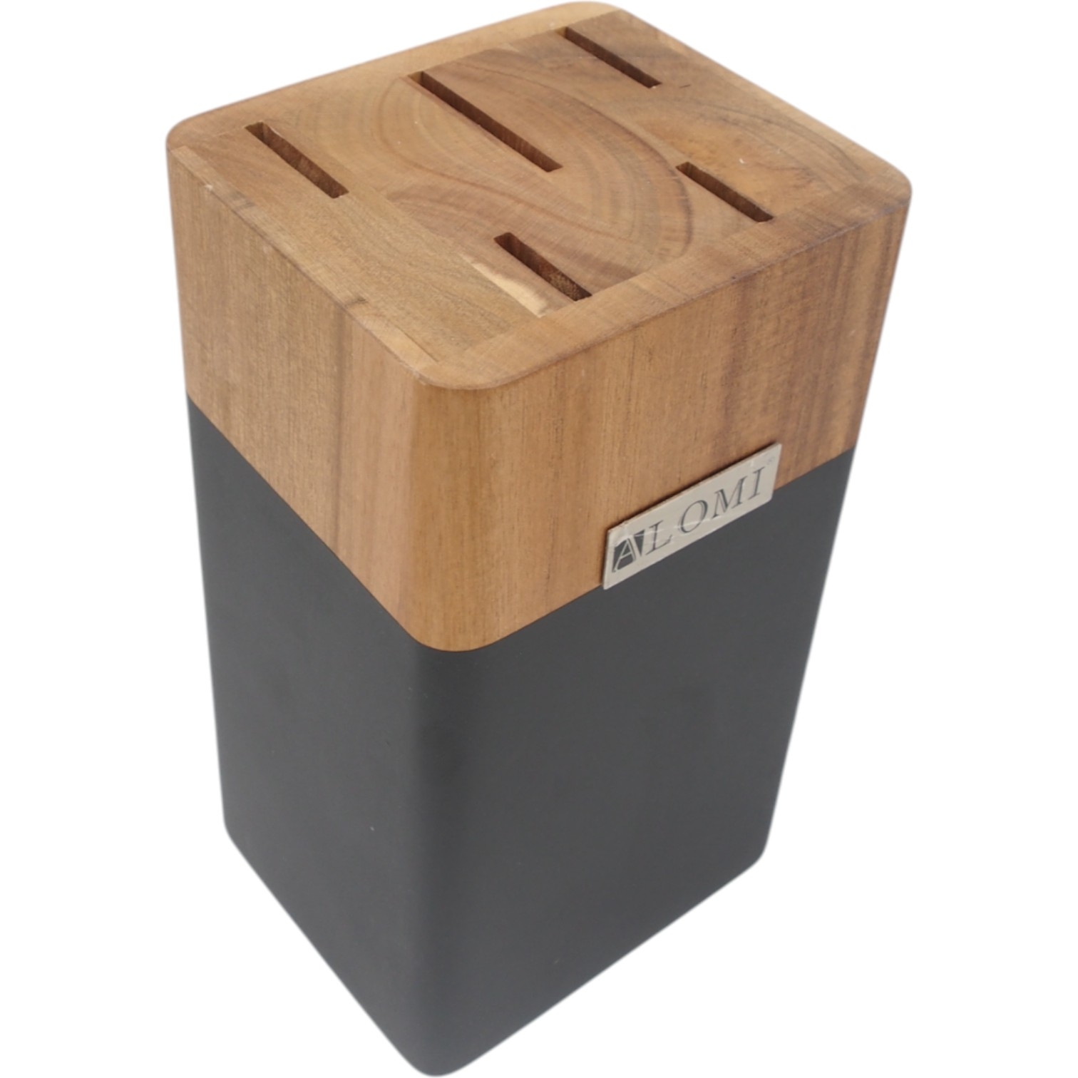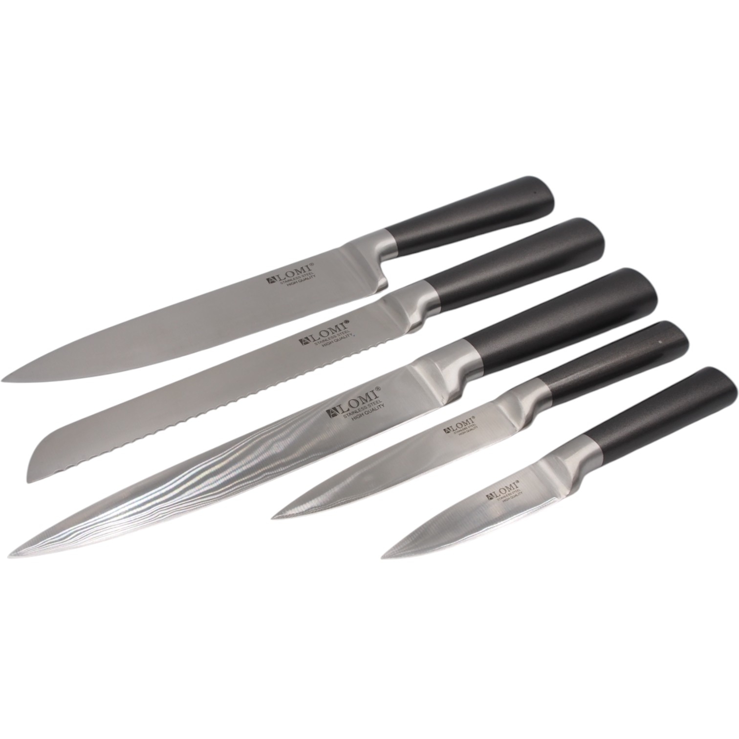 Aukštos kokybės ALOMI nerūdijančio plieno peilių rinkinys – tai praktiškas pasirinkimas kiekvienai virtuvei. Komplektą sudaro 5 aštrūs peiliai bei daržovių skustuvas, visi laikomi elegantiškame mediniame stove su moderniu juodos spalvos akcentu.