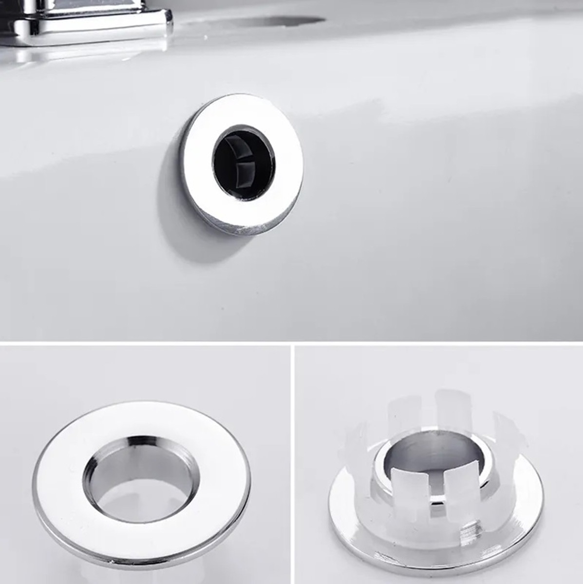Sidabrinės spalvos praustuvo perpildymo dangtelis. Apvali forma dailiai užmaskuoja skylę viršutinėje praustuvo dalyje. Paprastas ir neinvazinis montavimas .