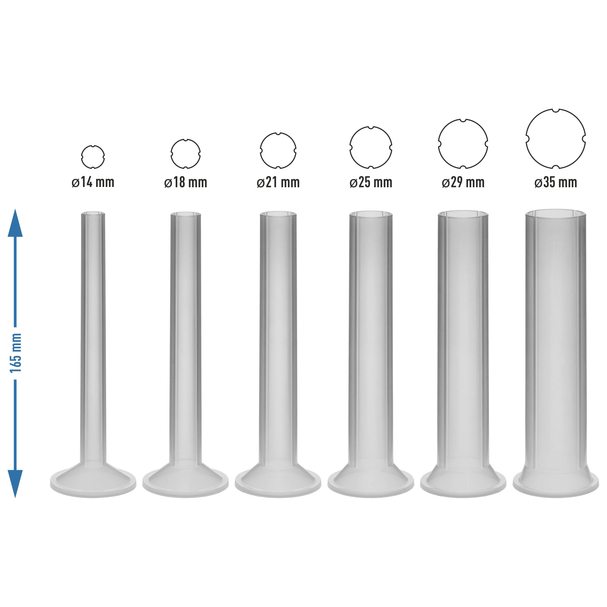 - 6 piltuvėliai (ø 14, 18, 21, 25, 29, 35 mm), kiekvienas 165 mm ilgio