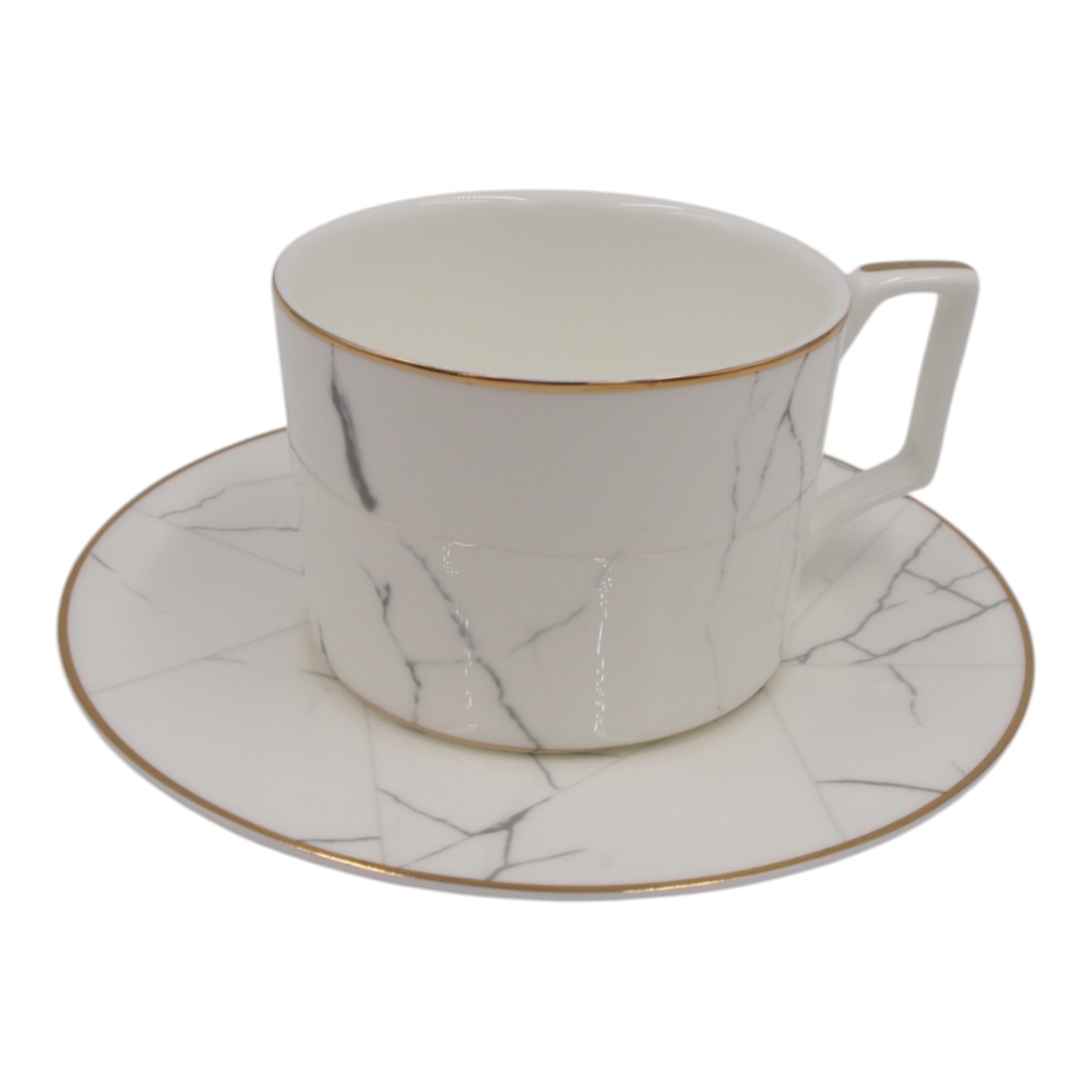 Elegantiškas porcelianinis puodelis su lėkštute, dekoruotas subtiliu marmuro raštu ir auksiniu krašteliu. Puikiai tinka kavai, arbatai ar karštam šokoladui. Modernus dizainas suteiks Jūsų stalui rafinuotumo, o kokybiška medžiaga užtikrins ilgaamžiškumą.