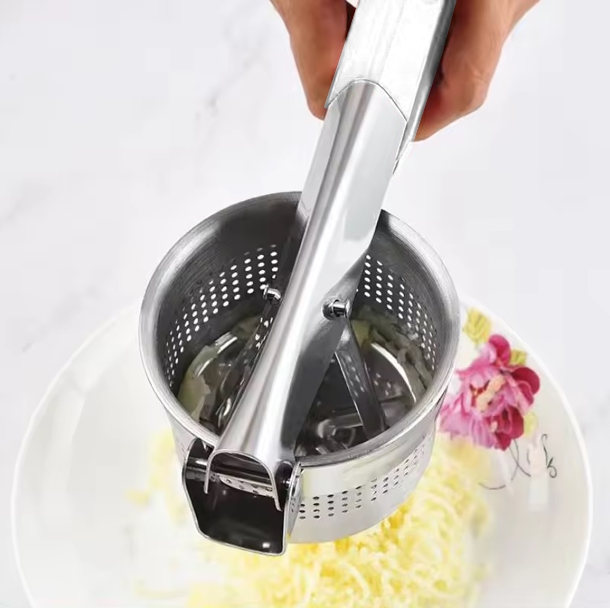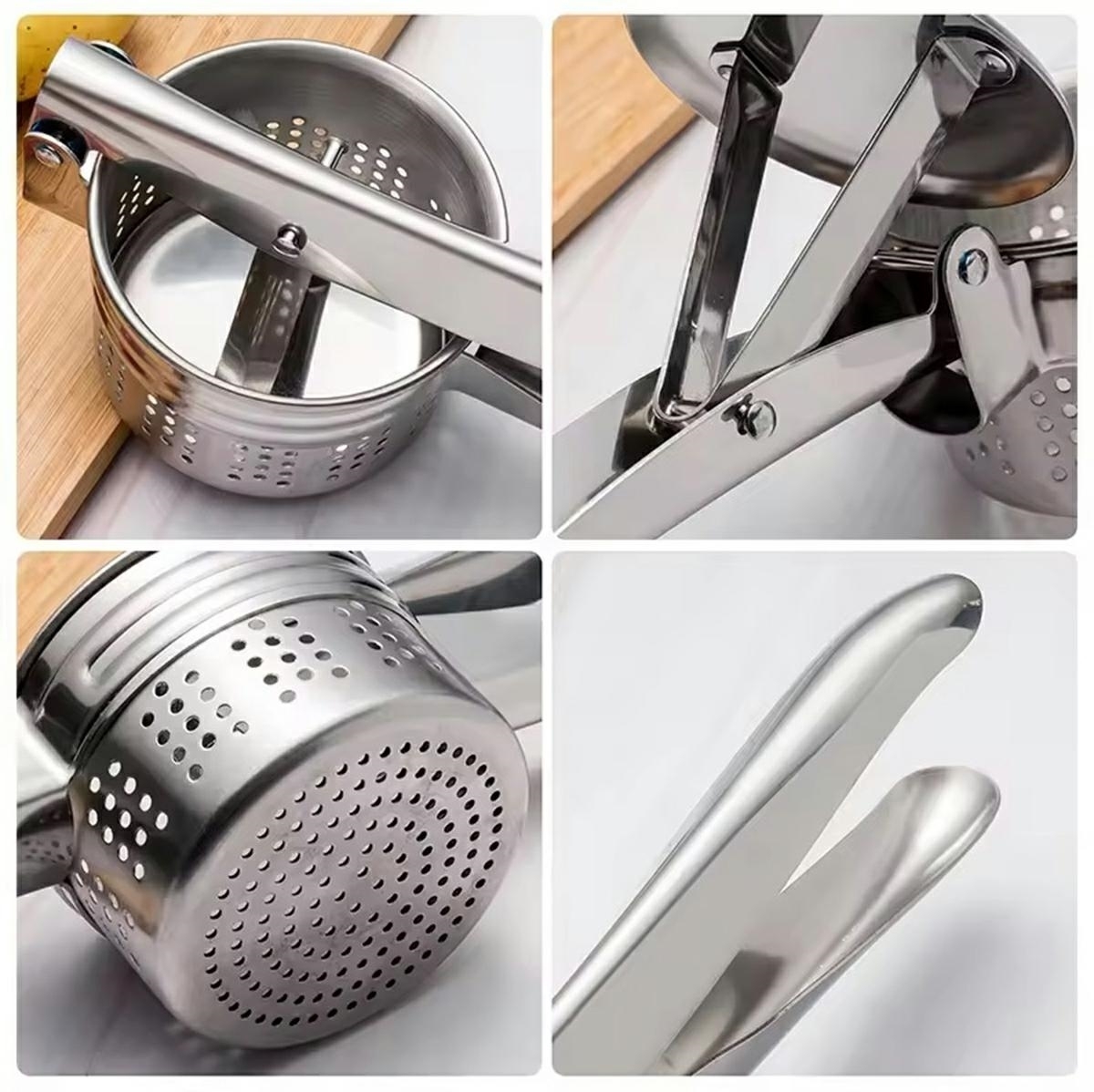 - Rankinis, plieninis presas bulvėms ir kitiems minkštiems vaisiams bei daržovėms spausti.
