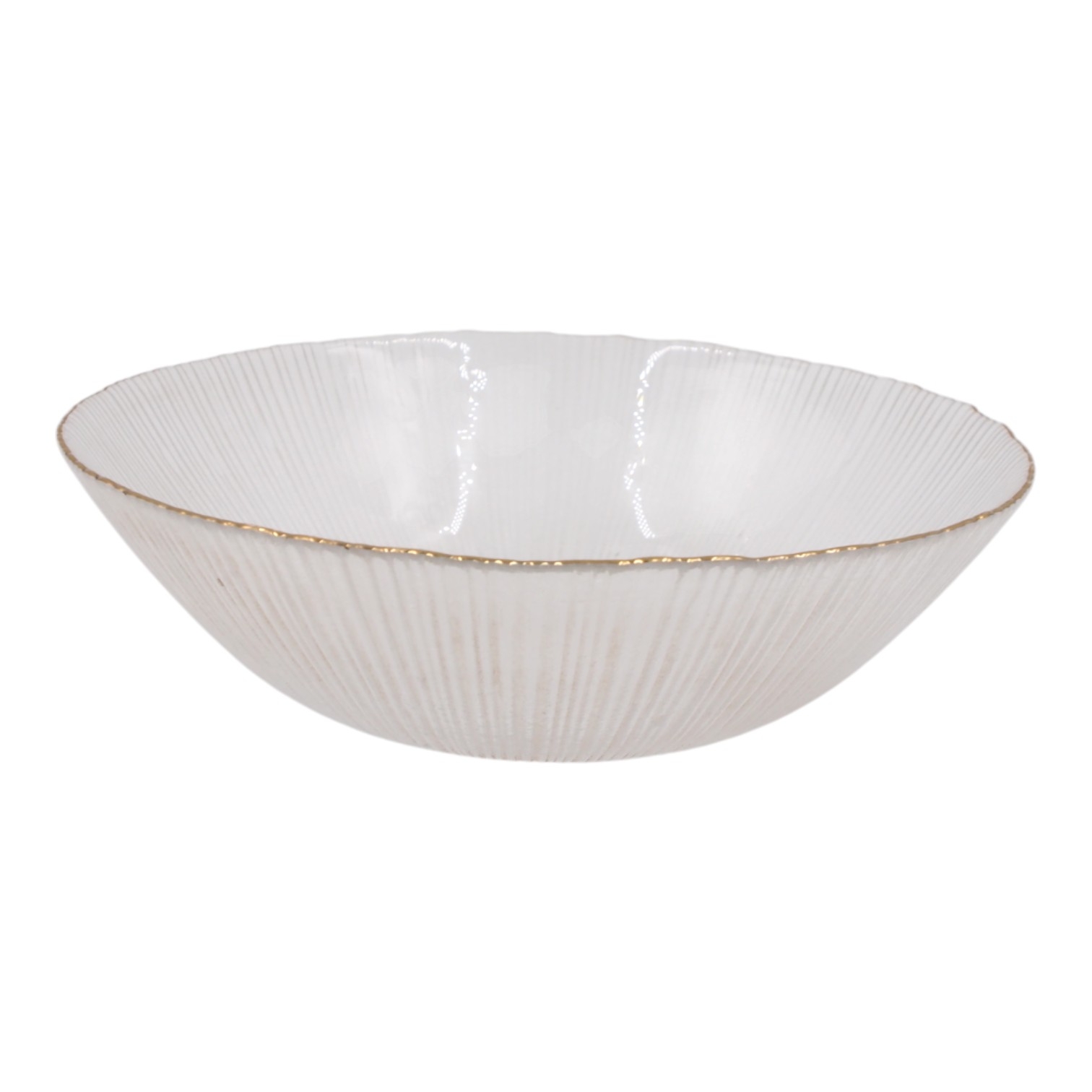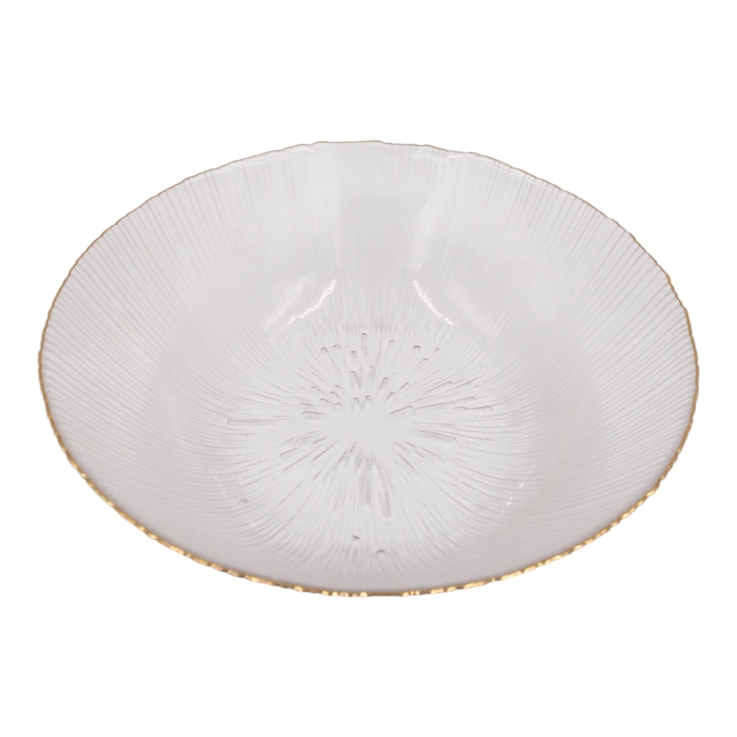 Išskirtinio dizaino stiklinis dubenėlis su subtiliomis tekstūromis ir elegantišku auksiniu krašteliu. Skaidrus paviršius bei švelnios linijos suteikia prabangos įspūdį, todėl šis indas puikiai tiks tiek kasdieniam naudojimui, tiek šventiniam stalo serviravimui.