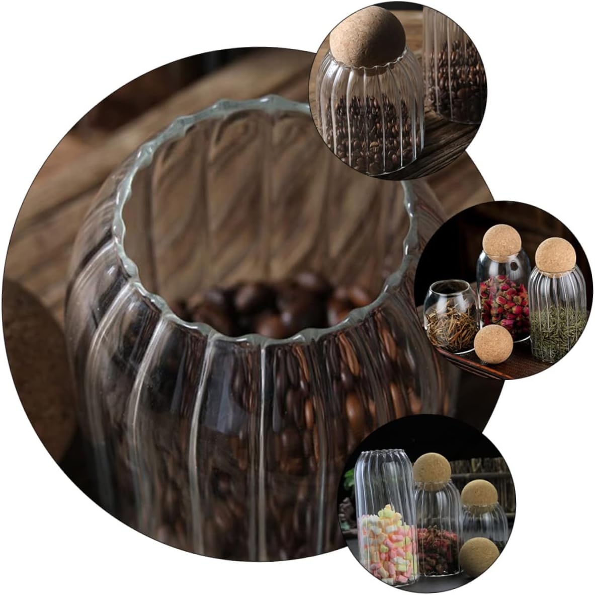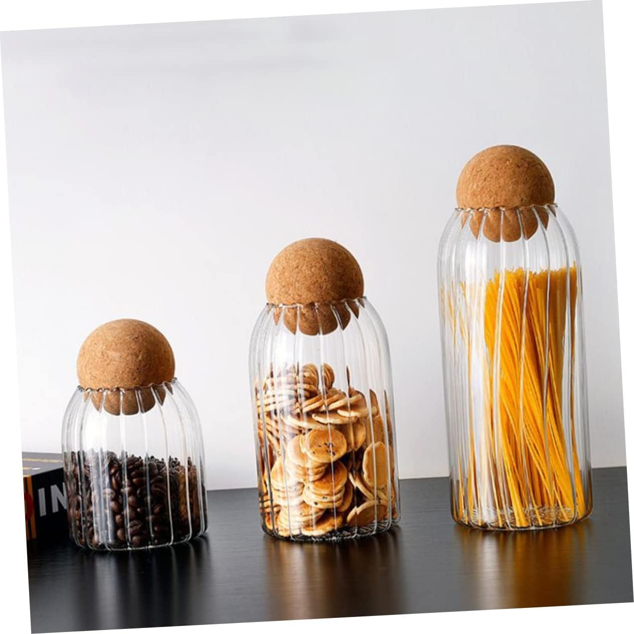 Stilingas ir praktiškas stiklinis indas su natūralaus kamščio dangteliu – puikus pasirinkimas maisto produktų laikymui ir namų interjero dekorui. Skaidrus, banguoto rašto stiklas suteikia elegancijos, o sandarus kamštinis dangtelis padeda išlaikyti produktų šviežumą.