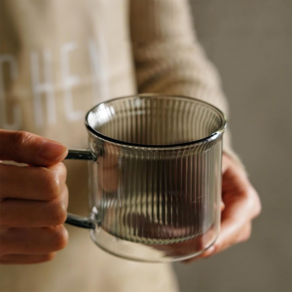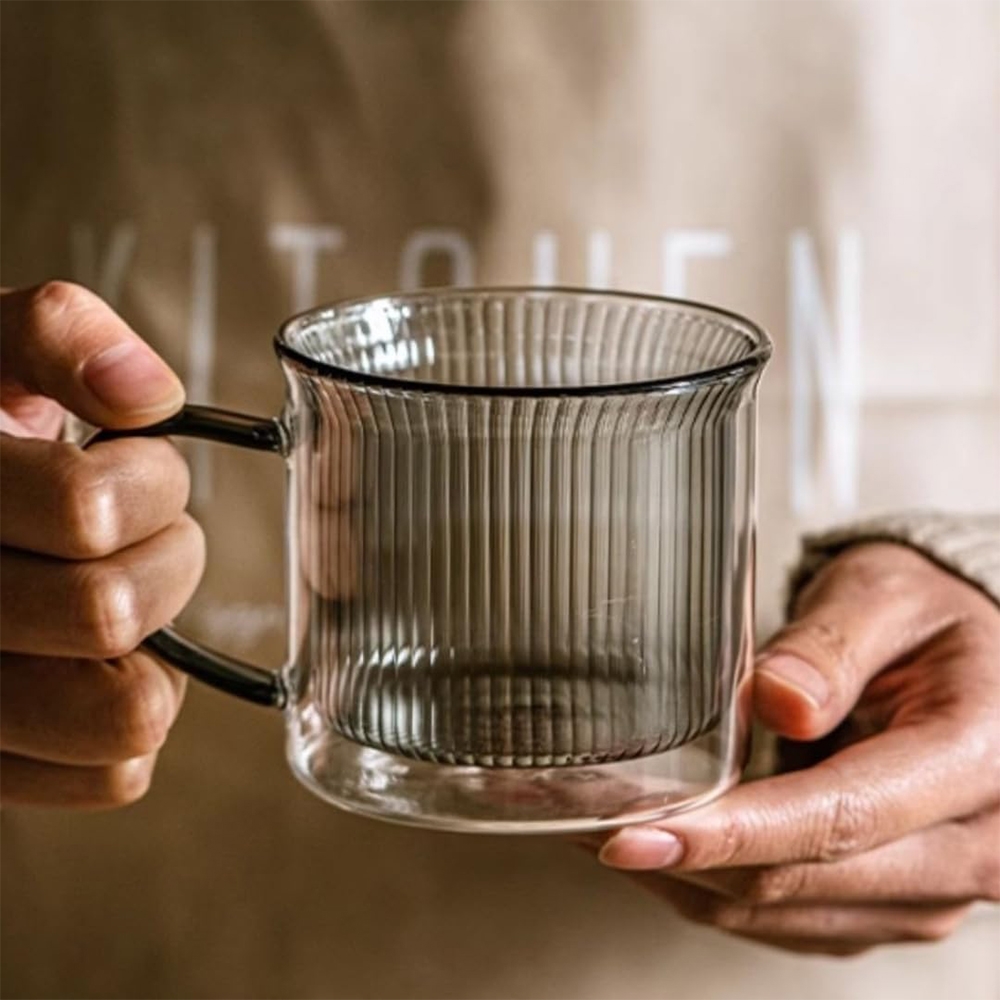 Dviejų sienelių stiklinė su rankenėle – 250 ml (rantuoto dizaino)