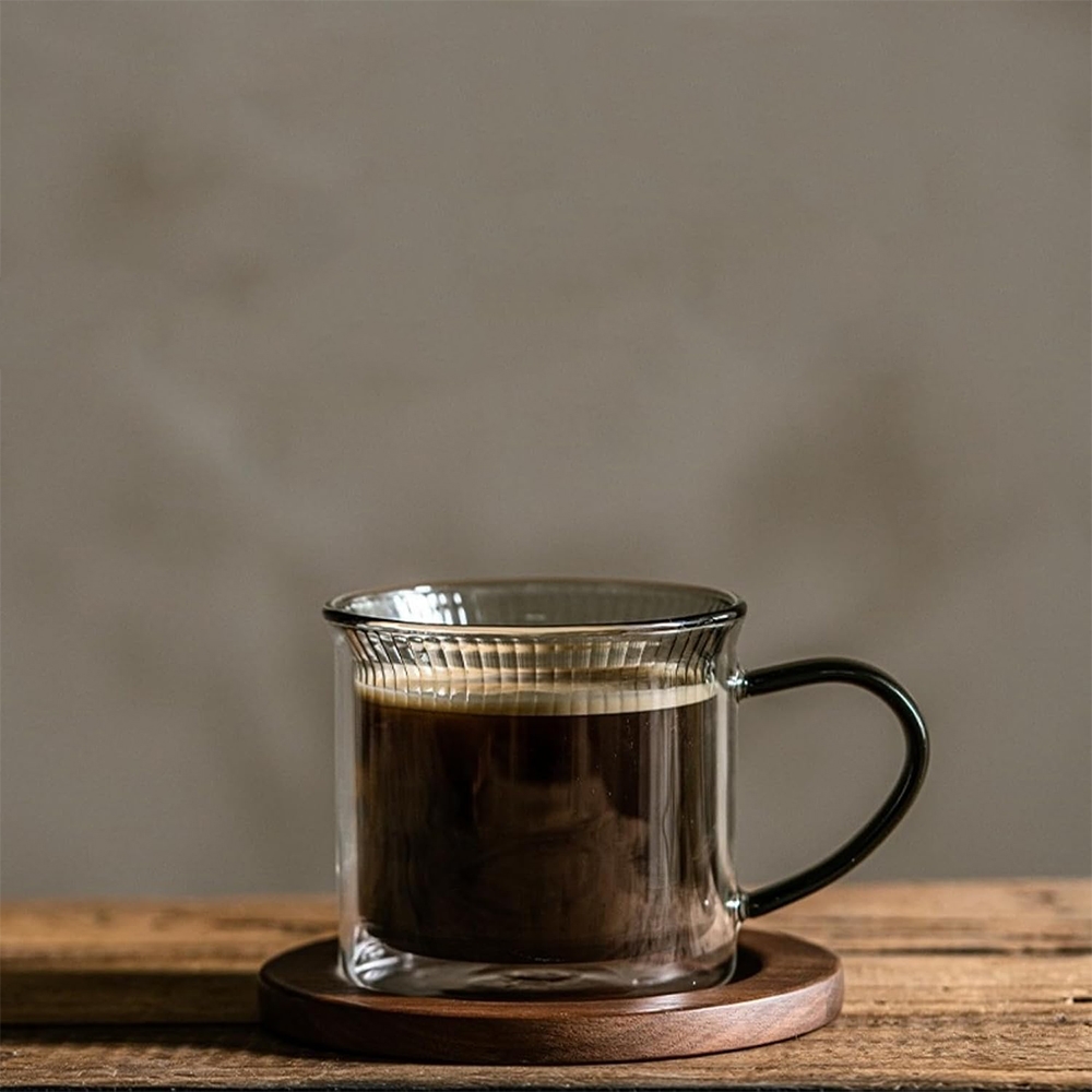 Stiklinė pasižymi moderniu, minimalistiniu stiliumi, kuris tinka bet kokiam interjerui – nuo jaukios namų virtuvės iki prabangios kavos studijos. Dviejų sienelių konstrukcija sukuria elegantišką vizualinį efektą, tarsi gėrimas „sklandytų“ stiklinės viduje. Rantuota tekstūra suteikia ypatingo charakterio bei užtikrina dar geresnį sukibimą laikant.